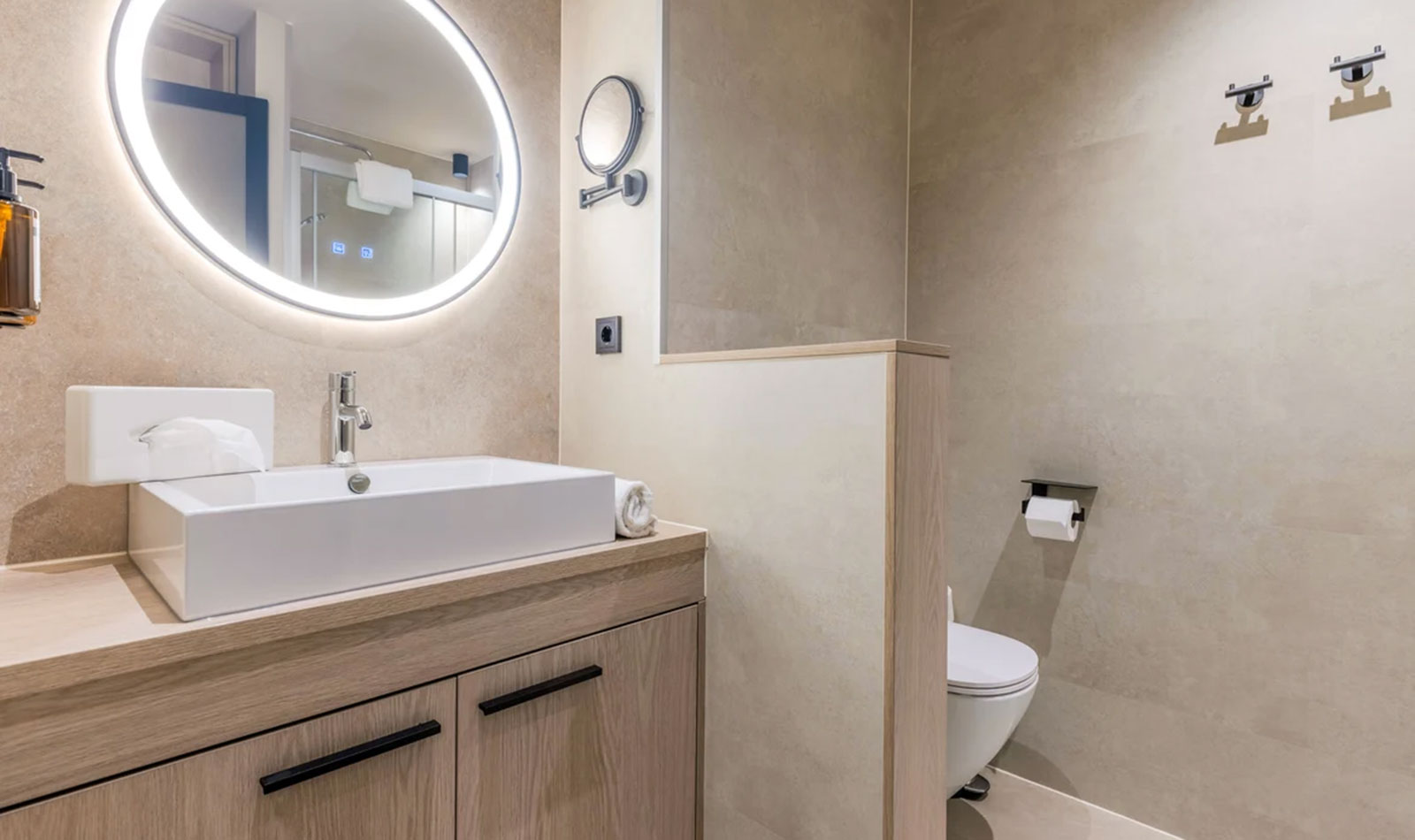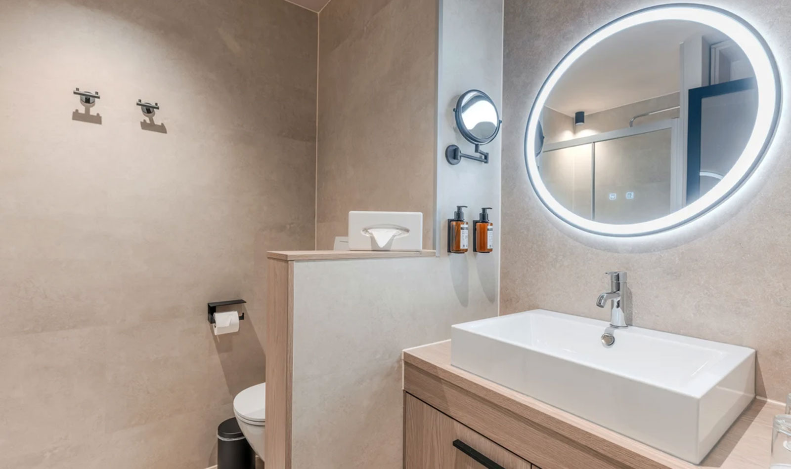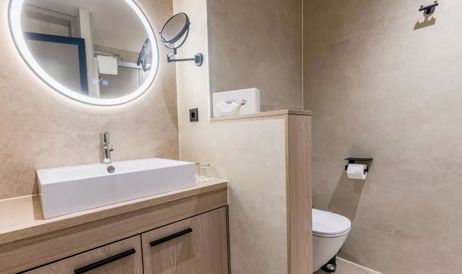 Alle Zimmer sind mit Dusche, WC, Haartrockner, Kosmetikspiegel, Bademantel, Fernseher, Telefon, Radio, Safe und Kühlschrank ausgestattet.SafeWLANTVKlimaanlage -
