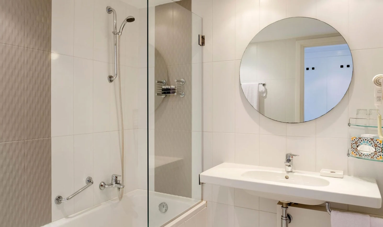 Details anzeigenBad mit Badewanne, ohne Meerblick/Poolblick, ca. 27 m². 3. Festbett im Dreibettzimmer: ca. 90 x 200 cm. Einzelzimmer sind Doppelzimmer zur Alleinbenutzung.