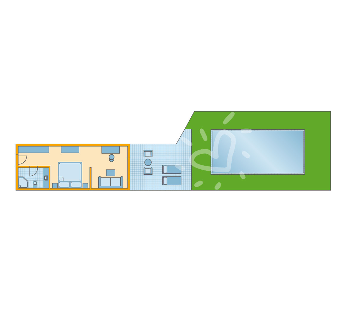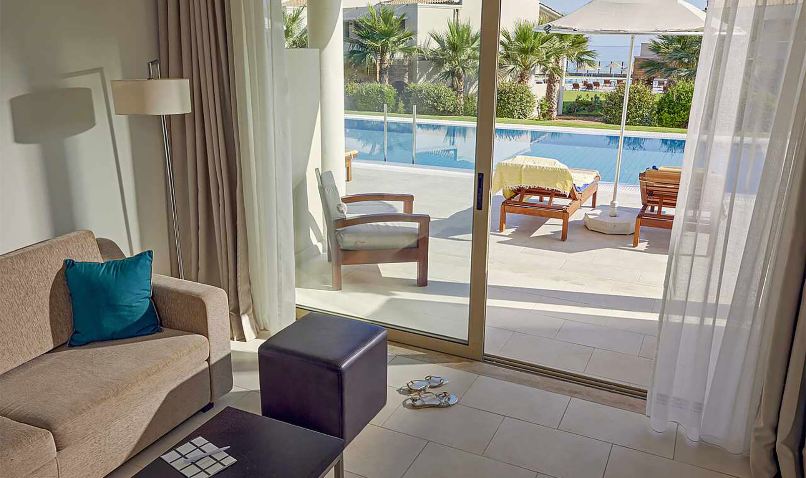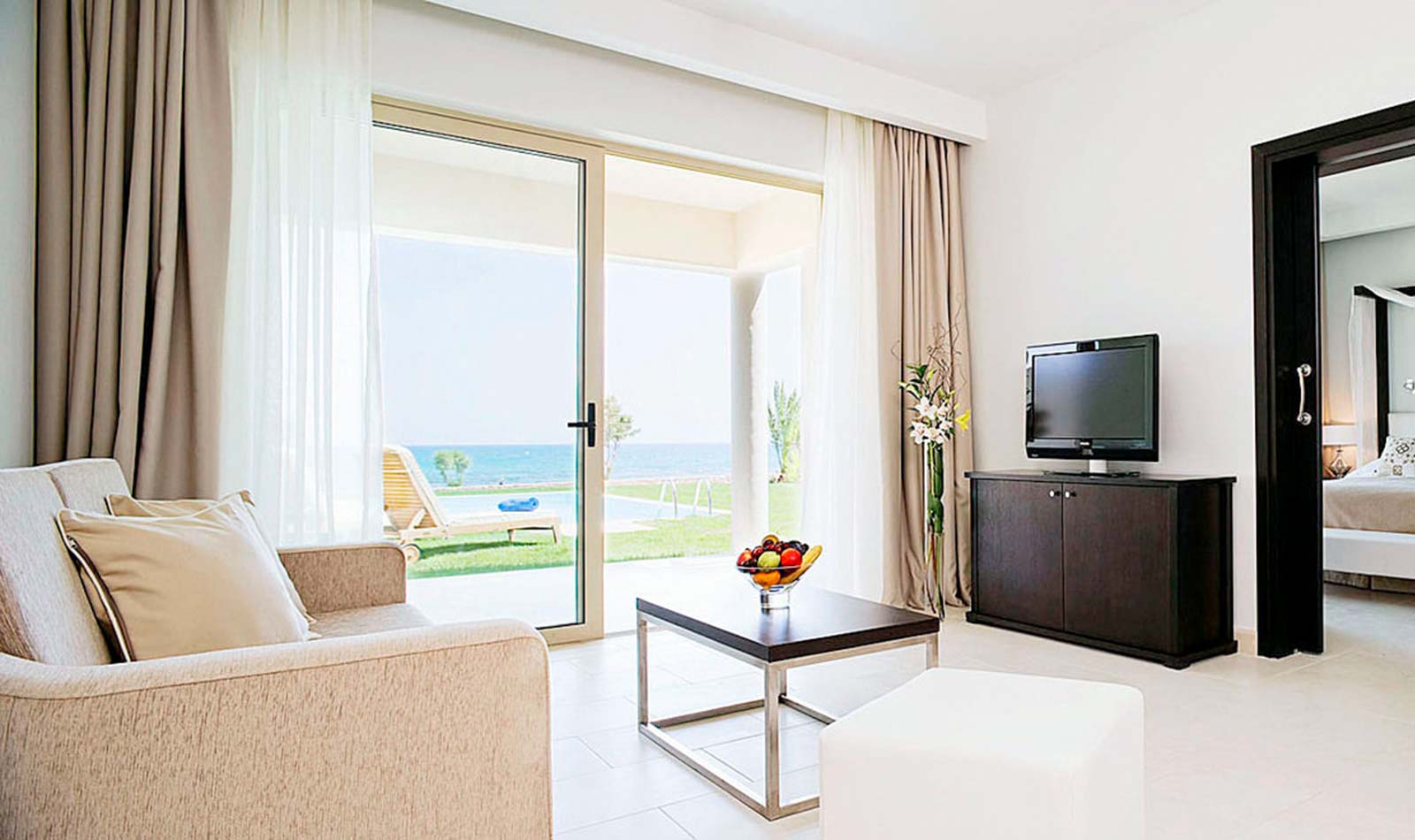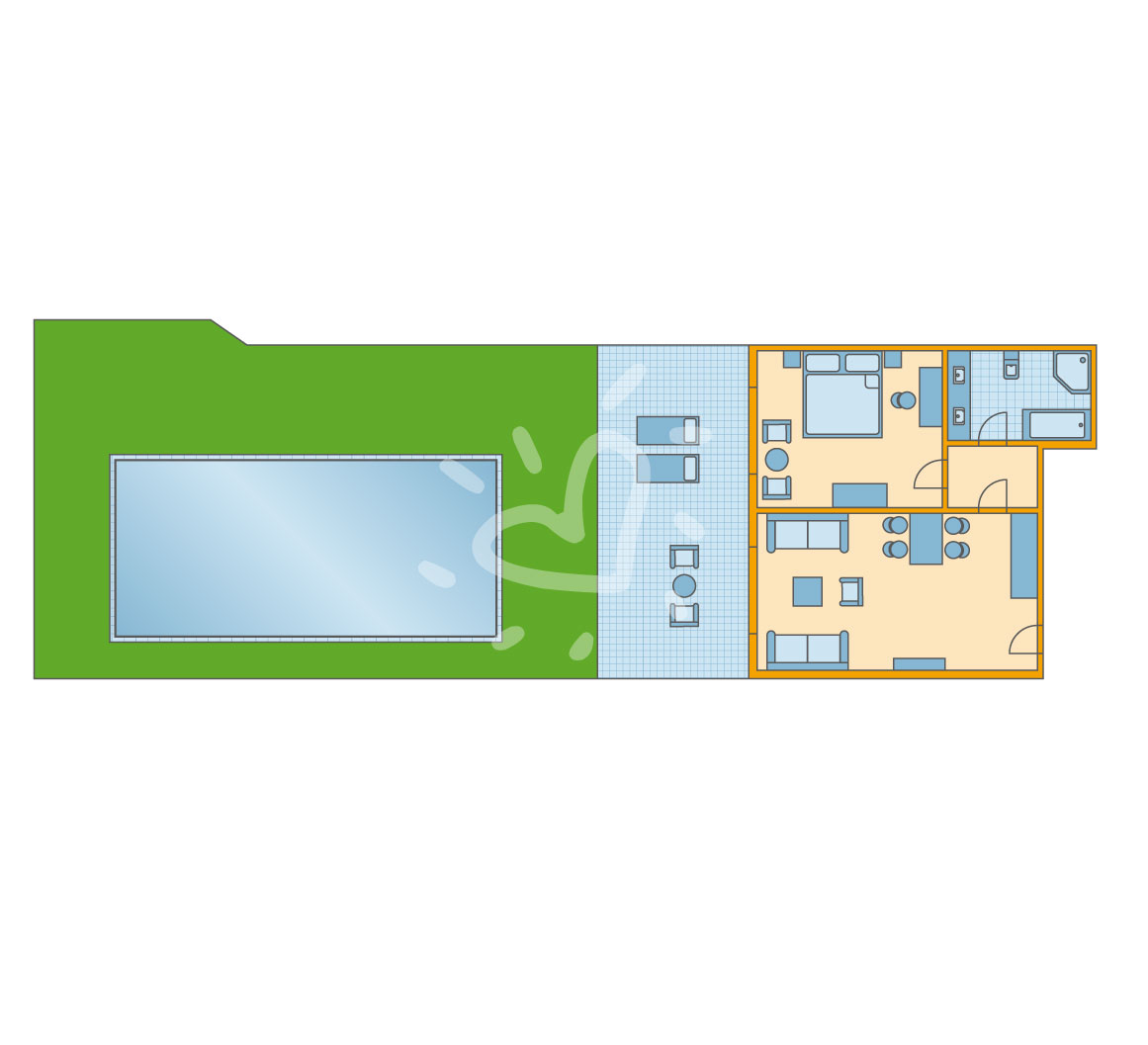Details anzeigenNichtraucherzimmer, letzte Komplettrenovierung 2008. Meerblick, Poolblick. Erdgeschoss. ca. 62 m². Gesamtanzahl der Räume in diesem Zimmertyp: 2, Aufteilung wie folgt: kombiniertes Wohn-/Schlafzimmer und 1 Schlafzimmer. King Size Bett. Mindest-/Maximalbelegung: mind. 2 Erwachsene / max. 3 Erwachsene. Die Unterbringung der 3. Person erfolgt auf einem Schlafsofa.