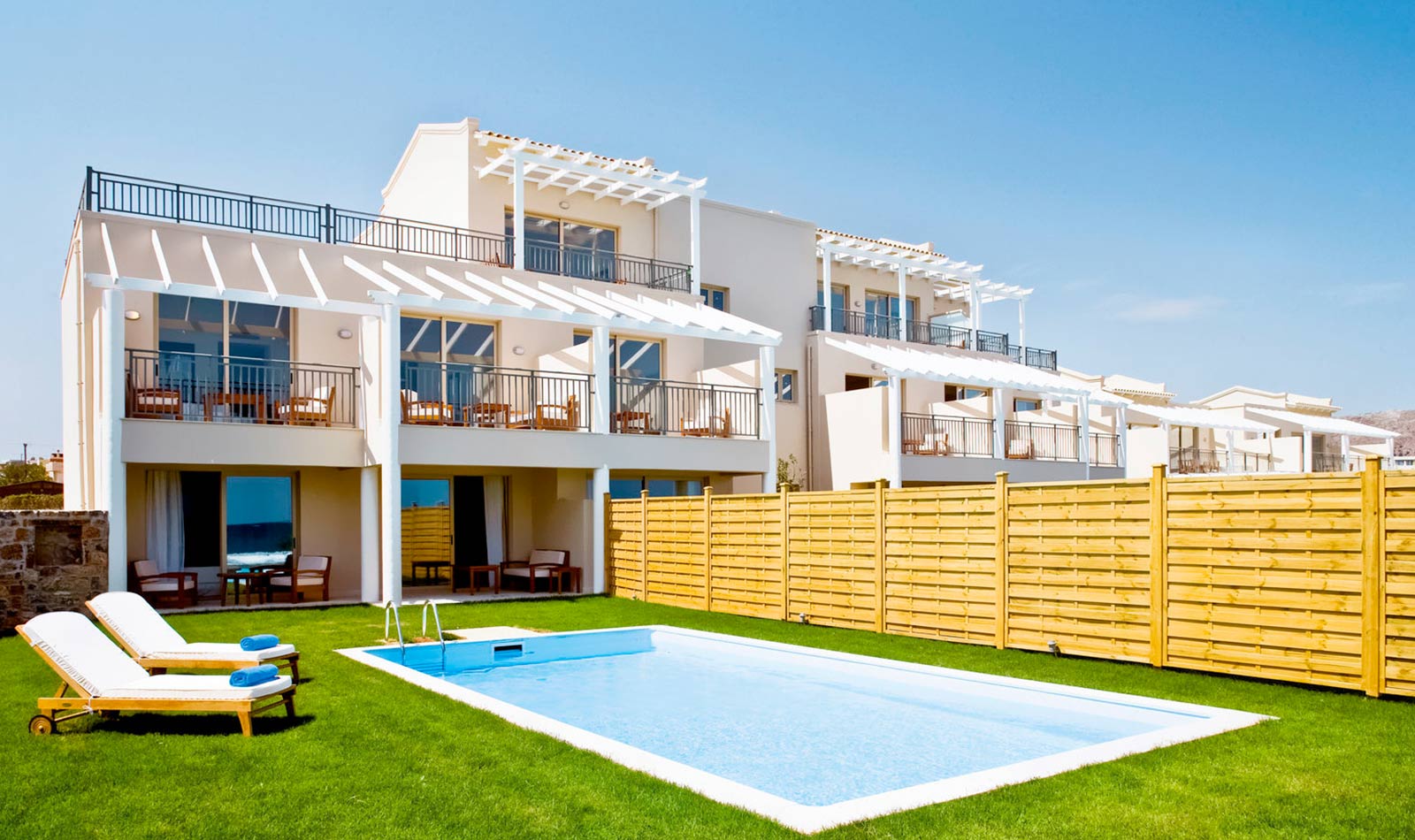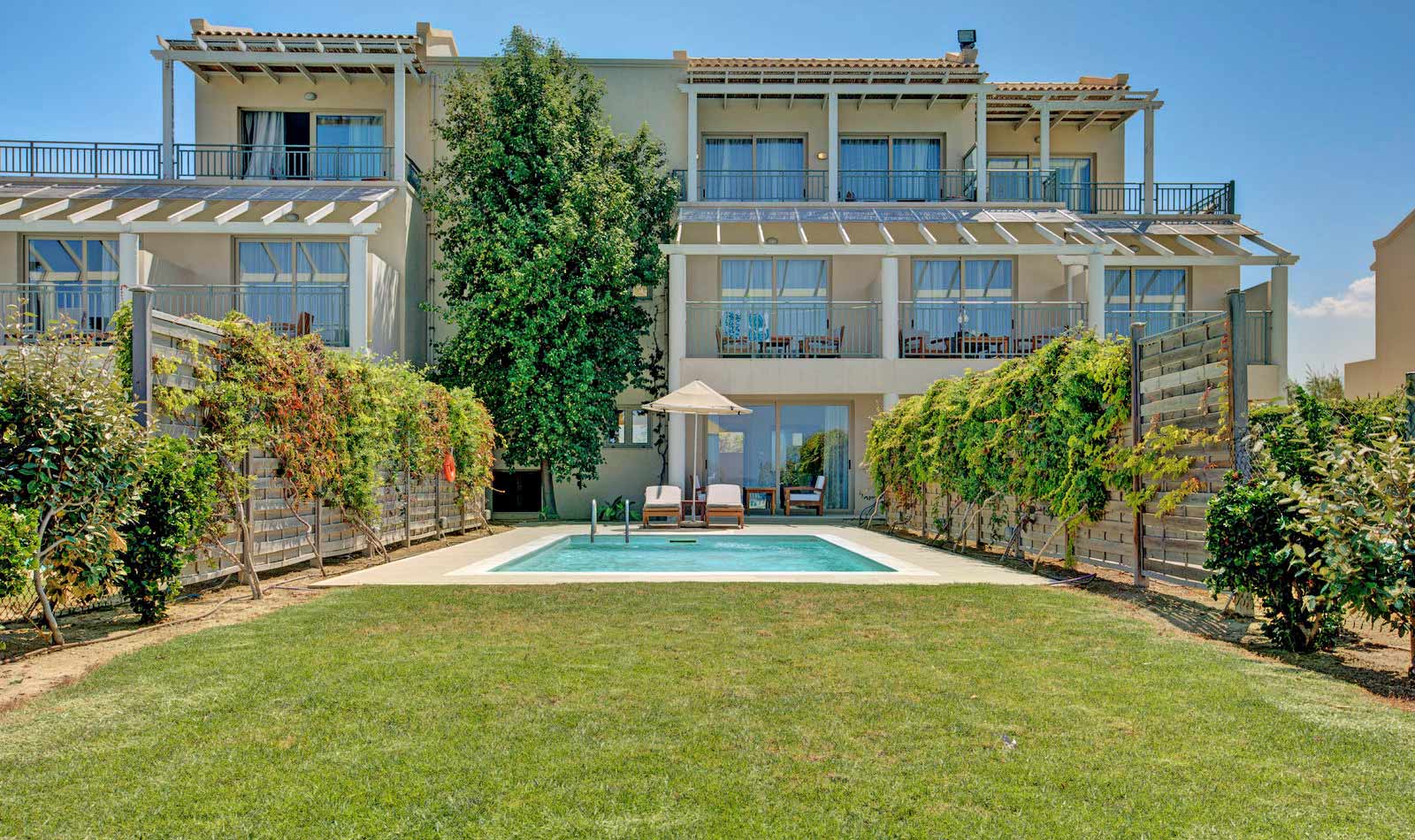 Klimaanlage: individuell regelbar, zentral gesteuert Fußboden: Fliesenboden Safe: ohne Gebühr Minibar: Wasser bei Anreise/Bedarf und Softdrinks bei Anreise Internet: WLAN/WiFi: ohne Gebühr, Fernseher: deutsches Programm, Sat-TV Roomservice: auf Anfrage, gegen Gebühr; Reinigungsservice: täglich Badewanne oder Dusche, WC, Föhn Terrasse: mit Private PoolSafeWLANTVKlimaanlageMeerblickBalkon -
