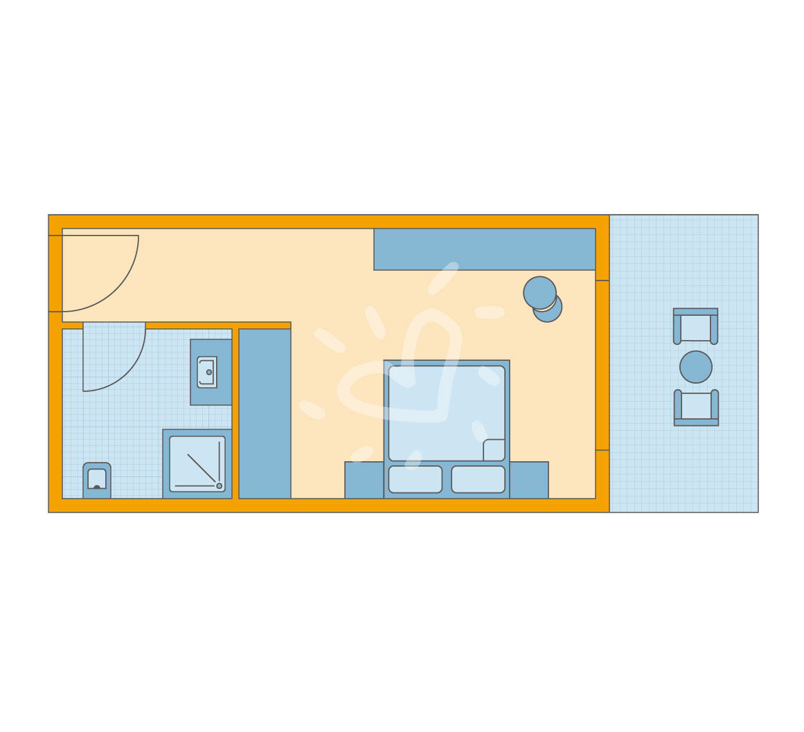 Klimaanlage: individuell regelbar, zentral gesteuert Fußboden: Laminat Safe: ohne Gebühr Minibar: Wasser bei Anreise/Bedarf und Softdrinks bei Ankunft Telefon, Internet: WLAN/WiFi: ohne Gebühr, Fernseher: deutsches Programm, Sat-TV Roomservice: auf Anfrage, gegen Gebühr, Reinigungsservice: täglich Dusche, WC, Föhn Balkon: mit SitzgelegenheitSafeWLANTVKlimaanlageBalkon -