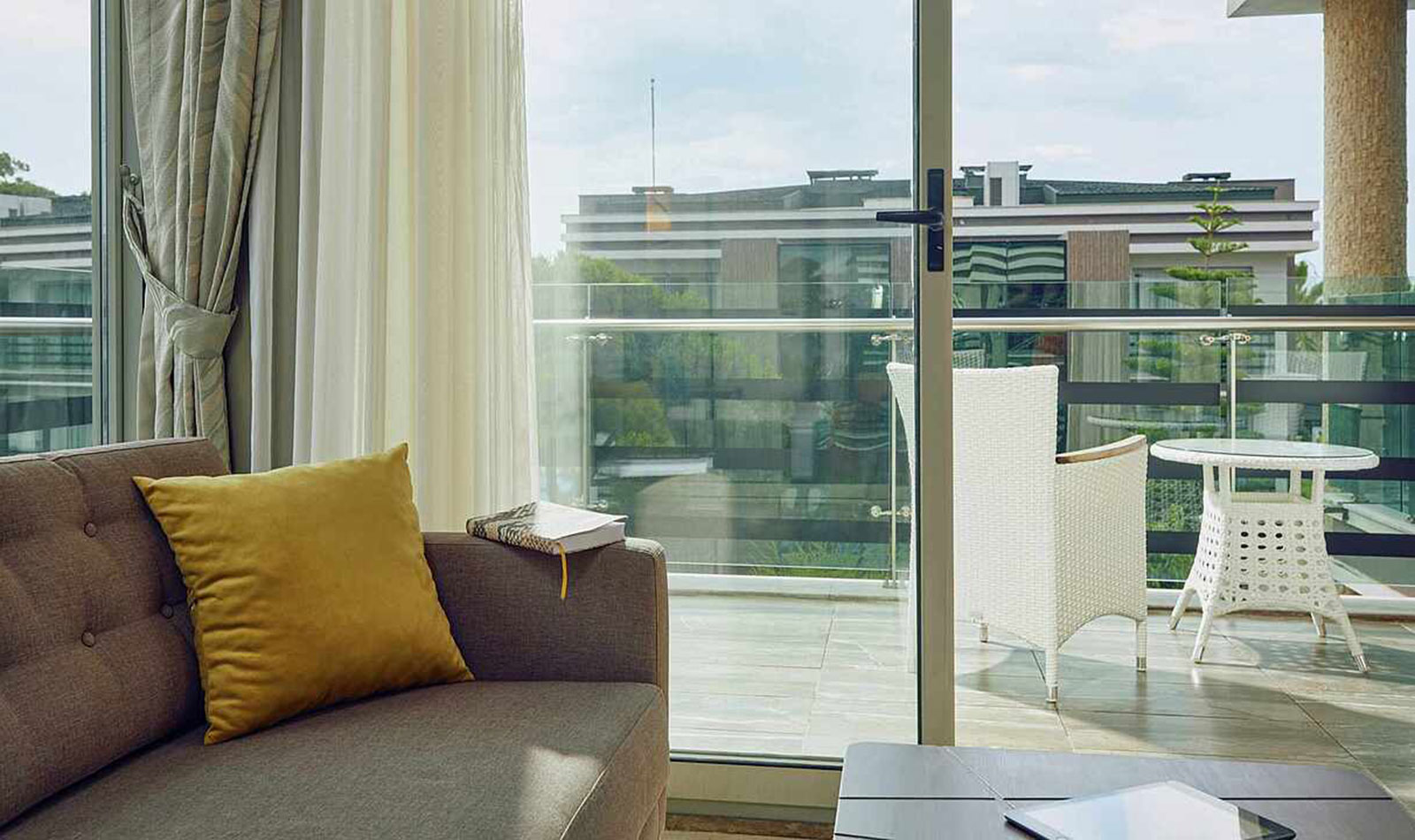 Klimaanlage: individuell regelbar, zentral gesteuert Fußboden: Laminat Safe: ohne Gebühr Minibar: Wasser bei Anreise/Bedarf und Softdrinks bei Ankunft Telefon, Internet: WLAN/WiFi: ohne Gebühr, Fernseher: deutsches Programm, Sat-TV Roomservice: gegen Gebühr, Reinigungsservice: täglich Dusche, WC, 2 Bäder, Föhn Balkon: mit SitzgelegenheitSafeWLANTVKlimaanlageBalkon