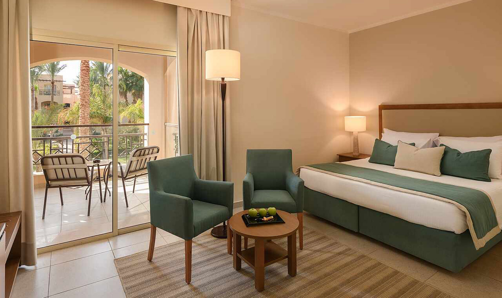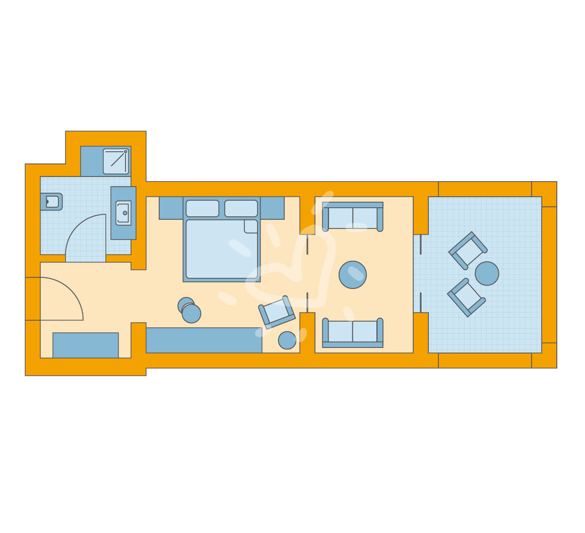 Klimaanlage: ohne Gebühr, individuell regelbar Fußboden: Fliesenboden Safe: ohne Gebühr Sofa Kaffee-/Teezubereiter, Wasserkocher Minibar: Wasser bei Anreise/Bedarf und Softdrinks bei Ankunft Telefon, Internet: WLAN/WiFi: ohne Gebühr, Fernseher: im Schlafzimmer, Sat-TV Roomservice: täglich, gegen Gebühr, Reinigungsservice: täglich, ohne Gebühr Dusche, WC, Föhn, Kosmetikspiegel Balkon oder Terrasse: mit SitzgelegenheitSafeWLANTVKlimaanlageBalkon -