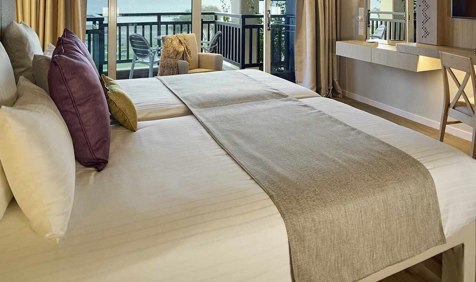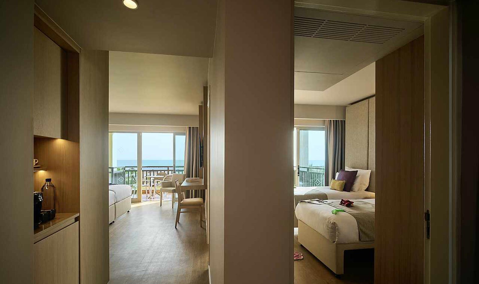 Details anzeigenNichtraucherzimmer, Meerblick, ca. 49 m², letzte Komplettrenovierung 2020 Gesamtanzahl der Räume in diesem Zimmertyp: 2, Aufteilung wie folgt: bestehend aus 2 Schlafzimmern, optisch getrennt durch Schiebetür 2 Einzelbetten (100x200cm), 1 King Size Bett (200x200cm), Babybett: ohne Gebühr Mindest-/Maximalbelegung: mind. 2 Erwachsene und 1 Kind ab 2 Jahren / max. 2 Erwachsene und 2 Kinder von 2-17 Jahre oder 3 Erwachsene und 1 Kind von 2-17 Jahre sowie zusätzlich 1 Kleinkind unter 2 Jahren