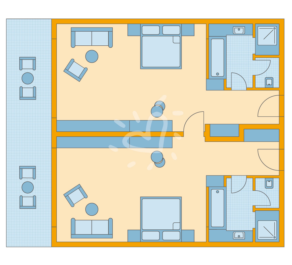 Details anzeigenNichtraucherzimmer, im Hauptgebäude, Pool- oder Gartenblick, ca. 80 m² Gesamtanzahl der Räume in diesem Zimmertyp: 2, Aufteilung wie folgt: bestehend aus 2 Doppelzimmern mit Verbindungstür, 2 Schlafzimmer 2 Doppelbetten (180x200cm), 2 Schlafsofas (90x175cm), Babybett: ohne Gebühr Mindest-/Maximalbelegung: mind. 2 Erwachsene und 1 Kind ab 2 Jahren / max. 4 Erwachsene, 2 Kinder/Jugendliche von 2-17 Jahre und 1 Kleinkind unter 2 Jahren Die Unterbringung der 5. und 6. Person erfolgt auf den Schlafsofas