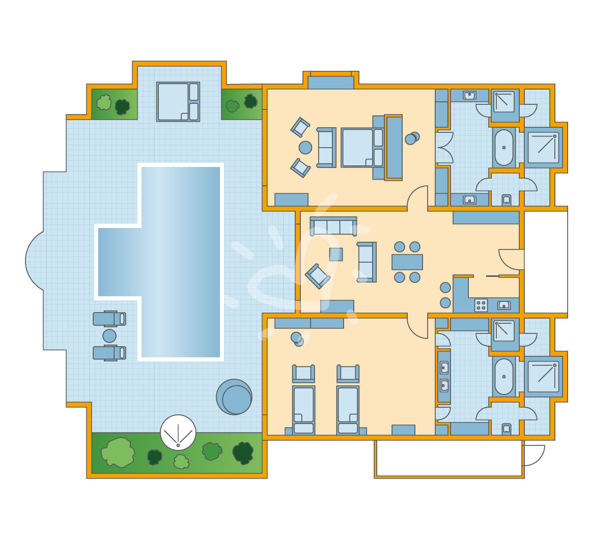 Klimaanlage: individuell regelbar Fußboden: Fliesenboden Safe: ohne Gebühr Deckenventilator Sitzecke, Schreibtisch Kühlschrank Telefon, Internet: teilweise WLAN/WiFi: ohne Gebühr, Fernseher: Flatscreen, Sat-TV, Radio Reinigungsservice: täglich Dusche, Badewanne, WC, separates WC, Bademantel, Föhn, Kosmetikspiegel Terrasse: mit Liegen, mit Sitzgelegenheit, mit Private PoolSafeWLANTVKlimaanlageBalkon -