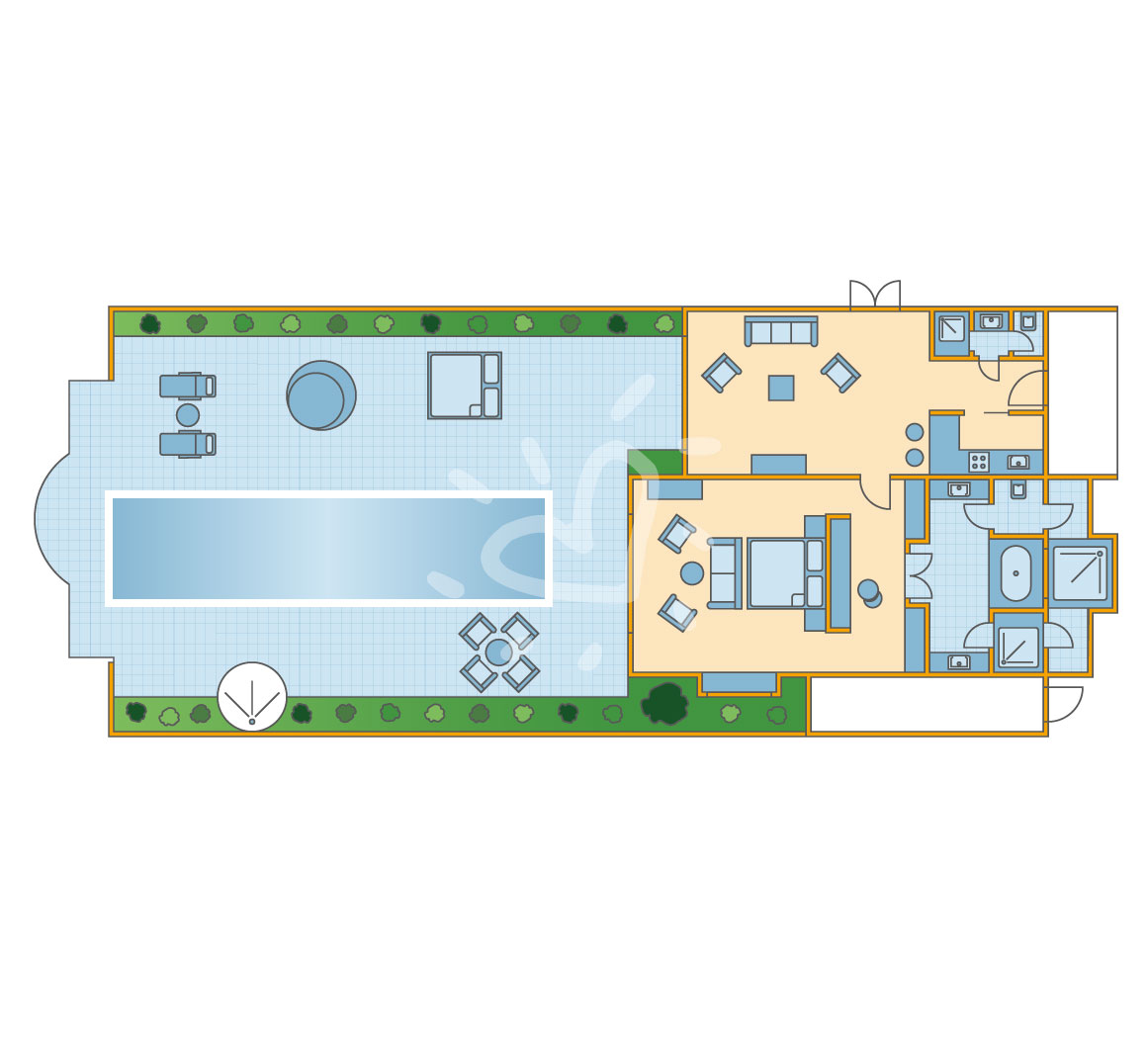 Details anzeigenNichtraucherzimmer, 1. Reihe mit direktem Zugang zum Strand, Meer- und Private Poolblick, ca. 133 m² Gesamtanzahl der Räume in diesem Zimmertyp: 2, Aufteilung wie folgt: Wohnzimmer, 1 Schlafzimmer 1 Doppelbett (180x200cm), 1 Schlafsofa (90x175cm), Babybett: ohne Gebühr Mindest-/Maximalbelegung: mind. 2 Erwachsene / max. 2 Erwachsene, 2 Kinder / Jugendliche von 2-17 Jahre und 1 Kleinkind unter 2 Jahren oder 3 Erwachsene und 1 Kleinkind unter 2 Jahren Die Unterbringung der 3. und 4. Person erfolgt auf dem Schlafsofa oder im Zustellbett