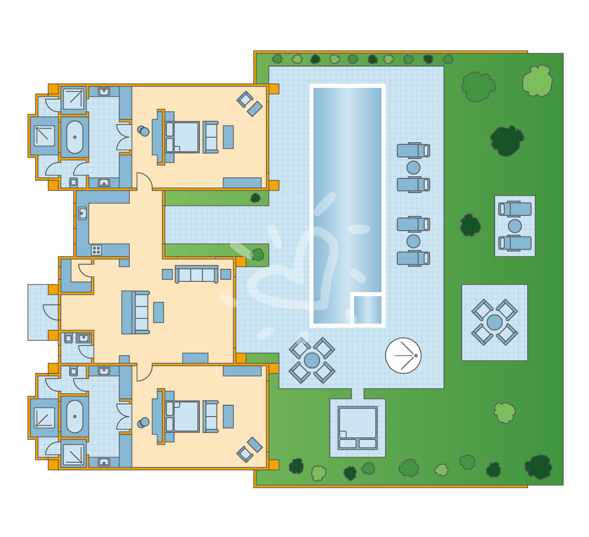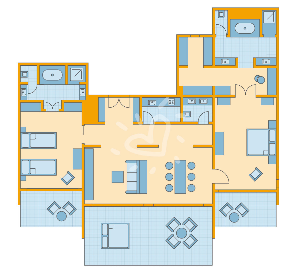 Details anzeigenNichtraucherzimmer, im Village, Garten- und Poolblick, ca. 364 m² Gesamtanzahl der Räume in diesem Zimmertyp: 5, Aufteilung wie folgt: Maisonette (über 3 Etagen), kombiniertes Wohn-/Esszimmer, 3 Schlafzimmer 2 Einzelbetten (90x200cm), 2 Doppelbetten (180x200cm), 2 Schlafsofas (90x175cm), Babybett: ohne Gebühr Mindest-/Maximalbelegung: mind. 2 Erwachsene und 2 Kinder ab 2 Jahren / max. 6 Erwachsene, 2 Kinder / Jugendliche 2-17 Jahre und 1 Kleinkind unter 2 Jahren Die Unterbringung der 7. und 8. Person erfolgt auf den Schlafsofas