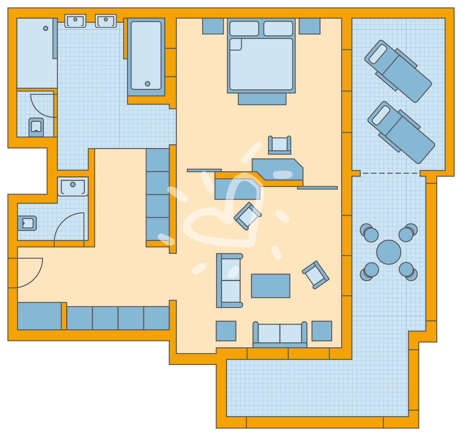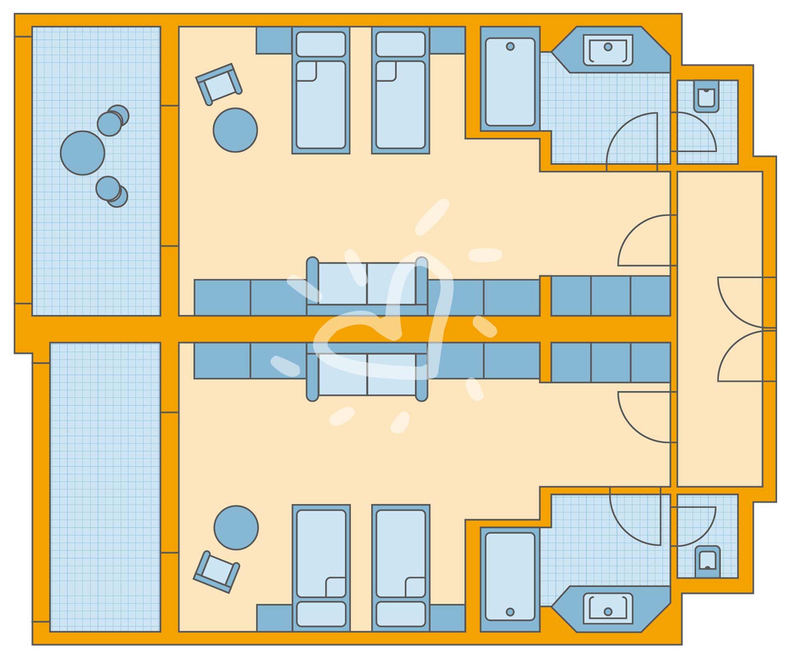 Details anzeigenNichtraucherzimmer, seitlicher Meerblick, ca. 45 m². Gesamtanzahl der Räume in diesem Zimmertyp: 2, Aufteilung wie folgt: bestehend aus 2 Zimmern (optisch getrennt durch Schiebetür), Wohnzimmer, 1 Schlafzimmer 1 Doppelbett (200x200cm, 2 zusammenstehende Einzelbetten), 1 Zustellbett (100x200cm), Babybett: ohne Gebühr Mindest-/Maximalbelegung: mind. 2 Erwachsene / max. 2 Erwachsene, 1 Kind von 2-14 Jahre und 1 Kleinkind unter 2 Jahren. Die Unterbringung der 3. Person erfolgt im Zustellbett.
