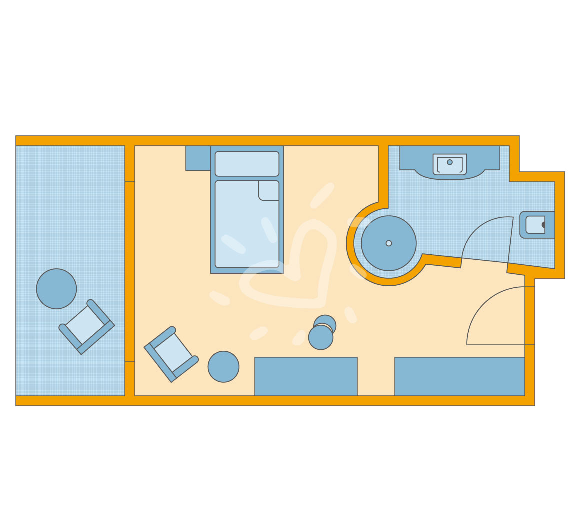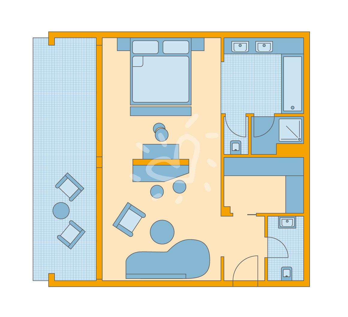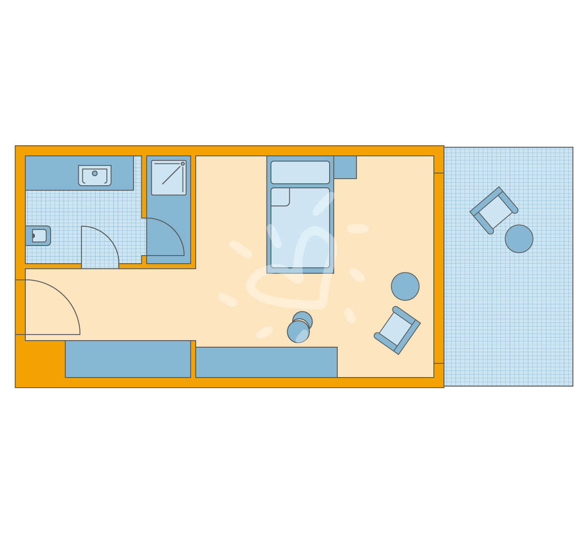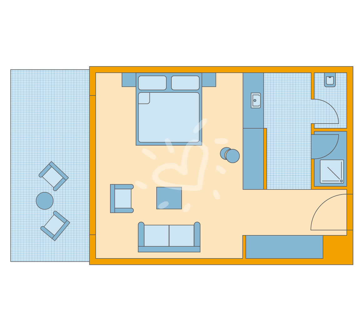 Klimaanlage: individuell regelbar, zentral gesteuert, kalt, warm Fußboden: Laminat Safe: ohne Gebühr Sitzecke begehbarer Kleiderschrank Kühlschrank, Kaffeezubereiter Telefon, Internet: WLAN/WiFi: ohne Gebühr, Fernseher: Flatscreen, deutsches Programm, Sat-TV, Radio Reinigungsservice: täglich Dusche, Badewanne, WC, separates WC, Föhn, Kosmetikspiegel Balkon oder Terrasse: mit Liegen, mit SitzgelegenheitSafeWLANTVKlimaanlageBalkon -