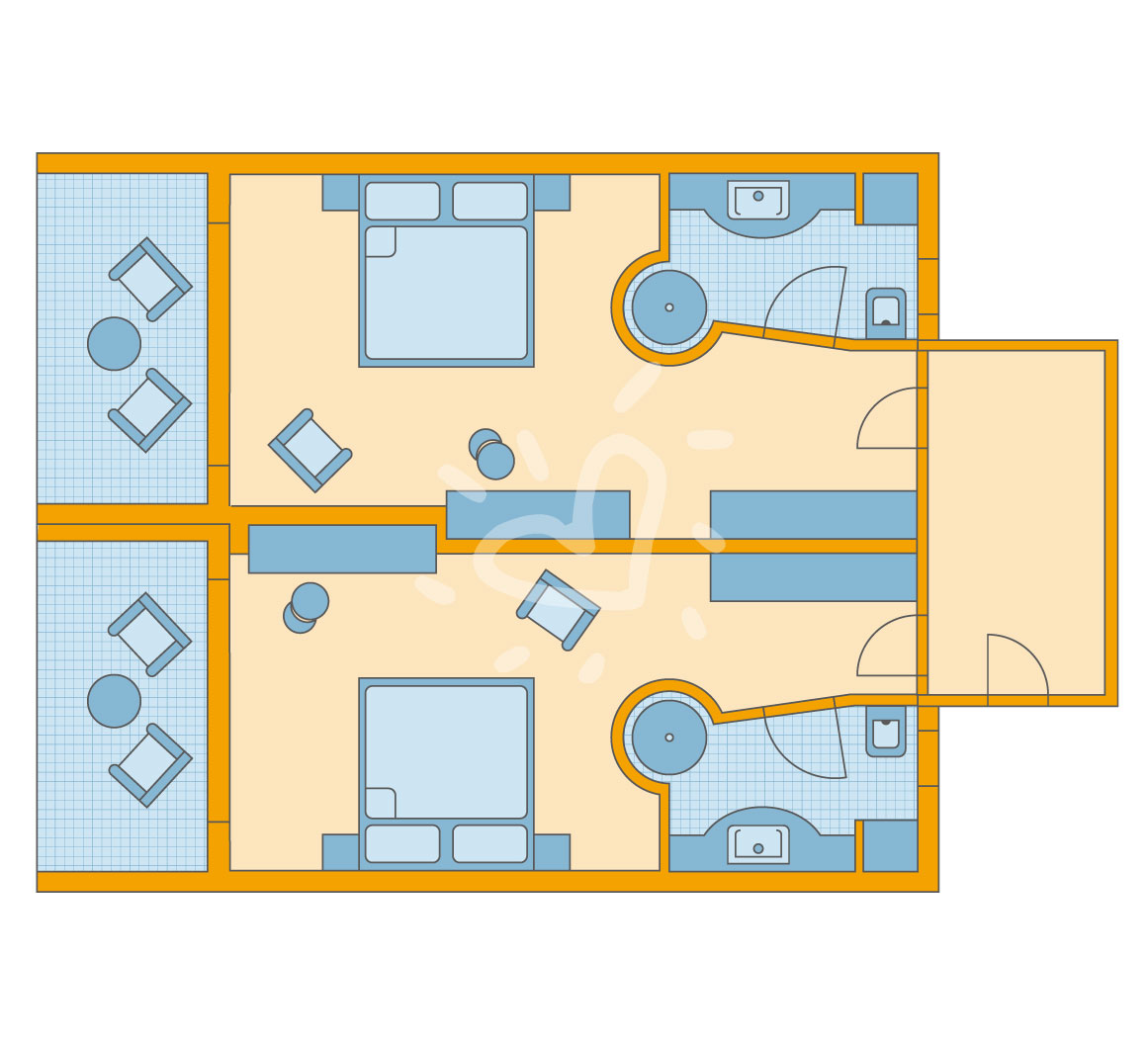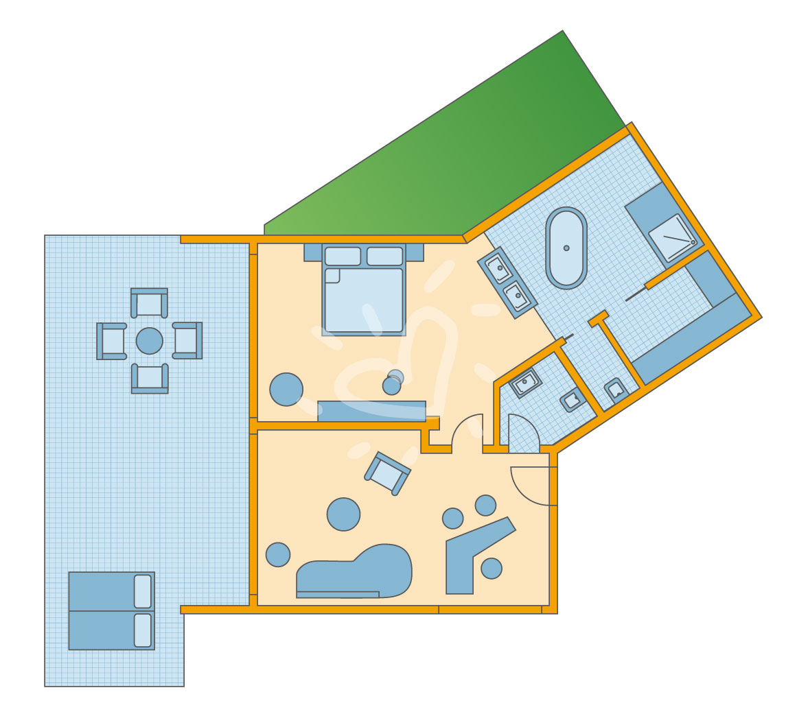 Klimaanlage: individuell regelbar, zentral gesteuert, kalt, warm Fußboden: Parkett Safe: ohne Gebühr Sitzecke begehbarer Kleiderschrank Kühlschrank, Kaffeezubereiter Telefon, Internet: WLAN/WiFi: ohne Gebühr, Fernseher: Flatscreen, deutsches Programm, Sat-TV, Radio Reinigungsservice: täglich Dusche, Badewanne, WC, zusätzliches separates WC, Föhn, Kosmetikspiegel Terrasse: mit Liegen, mit Sitzgelegenheit, mit Privat-Garten (Patio, 22 m²)SafeWLANTVKlimaanlageBalkon -