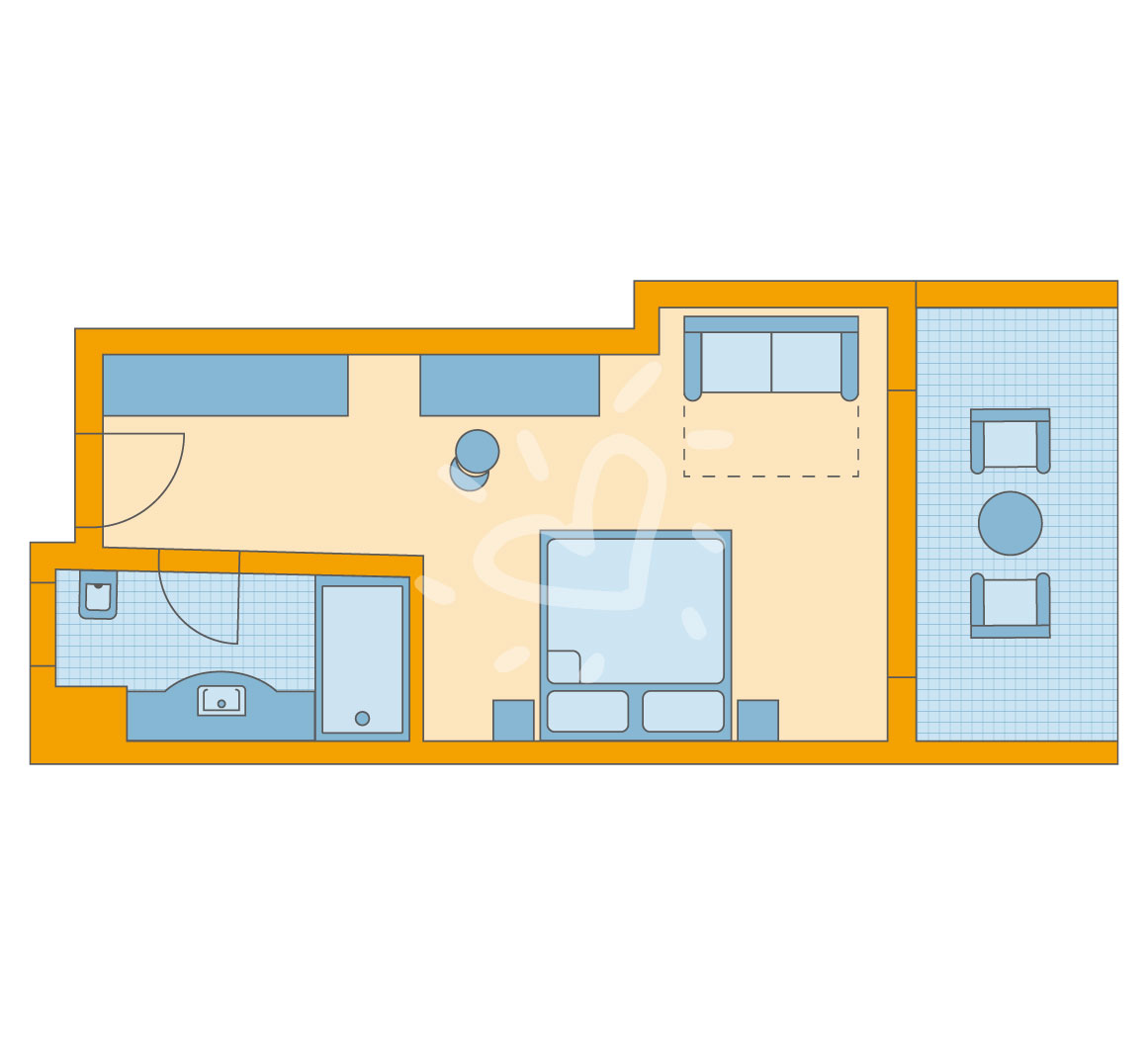 Klimaanlage: individuell regelbar, zentral gesteuert, kalt, warm Fußboden: Laminat Safe: ohne Gebühr Sofa Kühlschrank, Kaffeezubereiter Telefon, Internet: WLAN/WiFi: ohne Gebühr, Fernseher: Flatscreen, deutsches Programm, Sat-TV, Radio Reinigungsservice: täglich Dusche, WC, Föhn, Kosmetikspiegel Balkon oder Terrasse: mit SitzgelegenheitSafeWLANTVKlimaanlageBalkon -