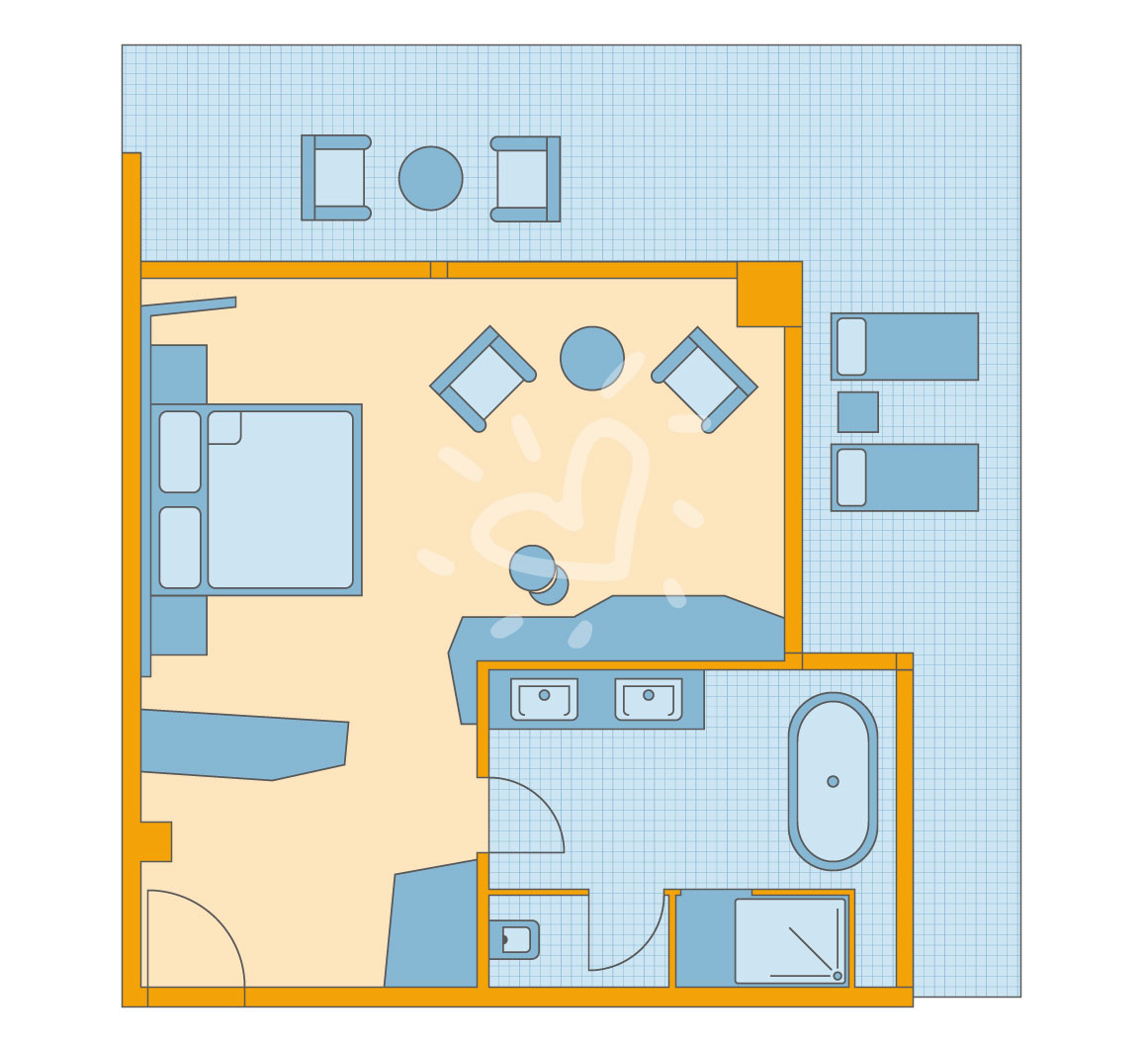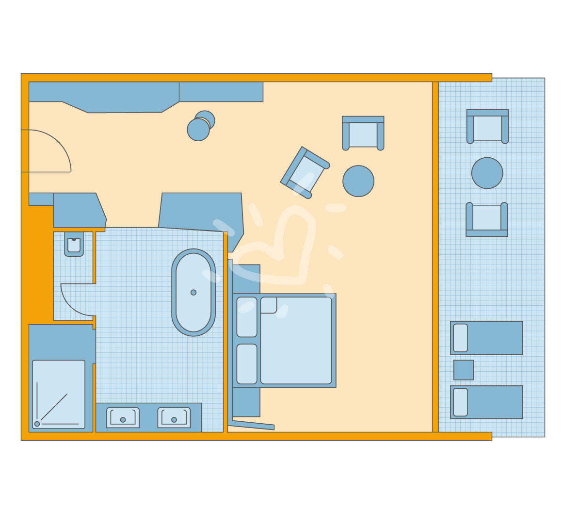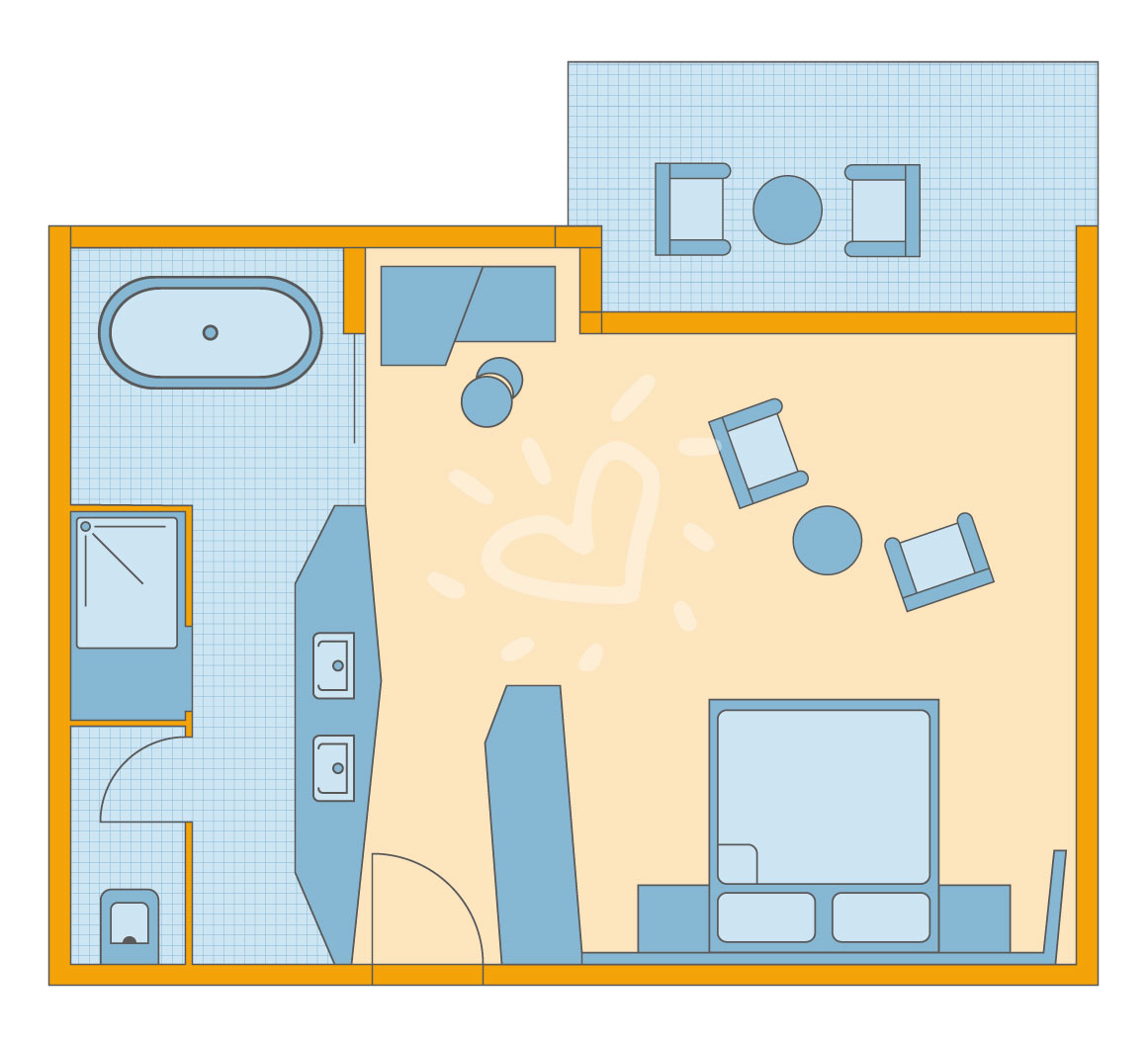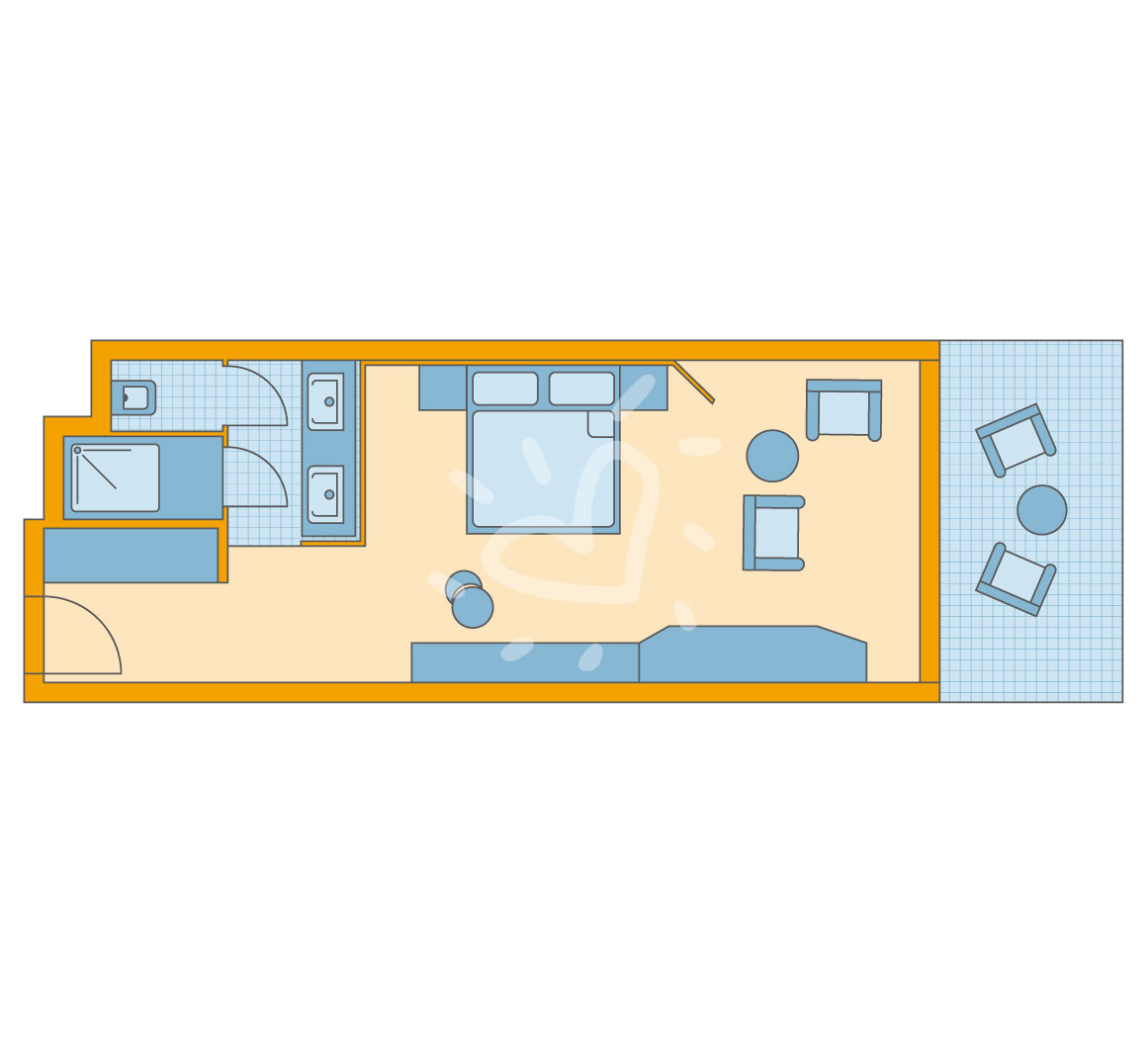 Klimadecke: zentral gesteuert, saisonabhängig Fußboden: Fliesenboden und Vinylboden Safe Sitzecke kleiner Kühlschrank Telefon, WLAN/WiFi: ohne Gebühr, Fernseher: Flatscreen, deutsches Programm, Sat-TV, Radio Reinigungsservice: täglich Bad mit Dusche, Badewanne, WC, Föhn, Kosmetikspiegel Balkon (ca. 16 m²): mit Liegen, mit SitzgelegenheitSafeWLANTVKlimaanlageBalkon -