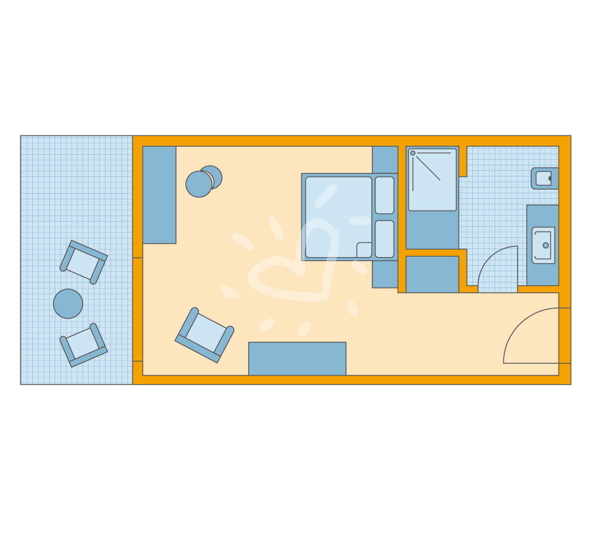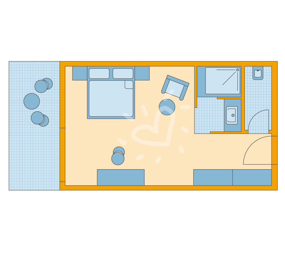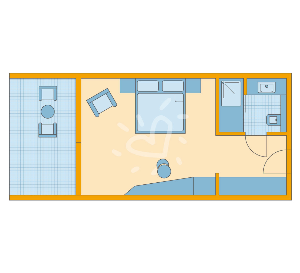 Klimaanlage: saisonabhängig, zentral gesteuert Safe kleiner Kühlschrank Telefon, Internet: WLAN/WiFi: ohne Gebühr, Fernseher: Flatscreen, deutsches Programm, Sat-TV, Radio Reinigungsservice: täglich Dusche, WC, Föhn, Kosmetikspiegel Balkon: mit SitzgelegenheitSafeWLANTVKlimaanlageBalkon